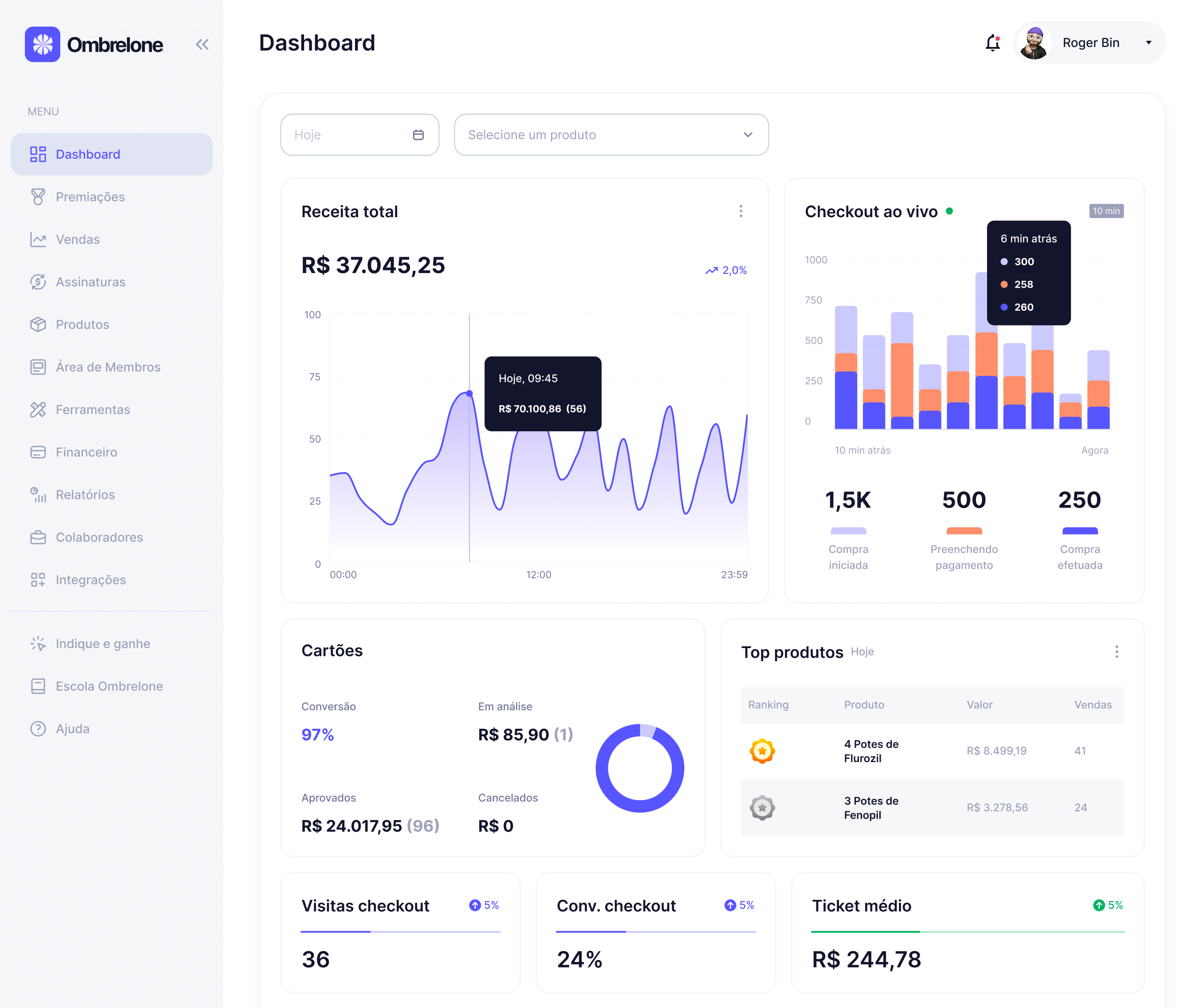 Na Ombrelone, você gerencia seu negócio por uma Dashboard completa e inovadora, tendo em destaque um checkout ao vivo para monitorar suas vendas em tempo real e otimizar conversões.